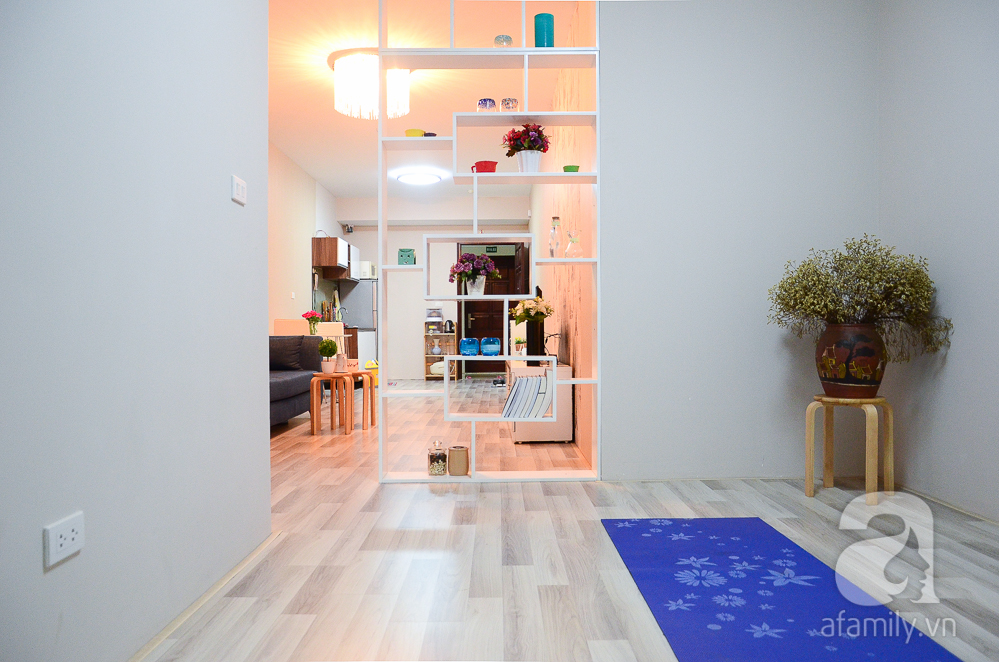 Để ngăn chia giữa khu vực phòng khách với phòng ngủ thứ hai, chiếc kệ thoáng hai mặt đã được "đo ni đóng giày" với tông màu trắng tiệp với các đồ gỗ khác như tủ bếp, tủ giày, kệ ti vi,..., và được chăm chút với những đồ trang trí tinh tế, dễ thương. Có thể dễ dàng nhìn thấy sự kỹ càng trong bài trí của căn hộ, với sự hiện diện của hoa tươi, cây xanh, và các chi tiết trang trí đồng tông như gốm sứ trắng cùng tông đồ gỗ, bình lọ xanh tiệp màu ghế sofa,...