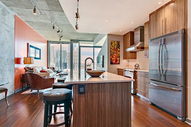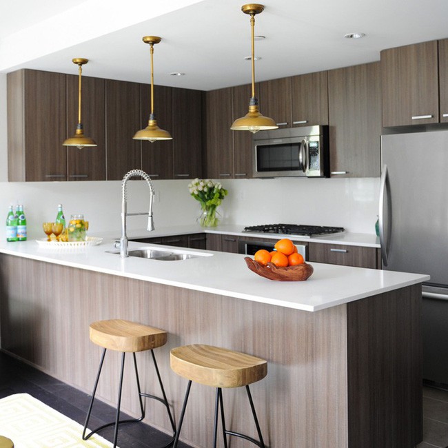10. Bạn có thể chọn màu gỗ nổi bật cho góc bếp. Không gian nấu nướng cùng hệ thống tủ đựng đồ được bố trí dọc theo một bức tường sẽ không khiến bạn tốn thêm diện tích sử dụng nhưng vẫn đủ đầy cho cuộc sống sinh hoạt thường ngày.