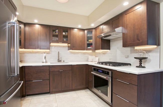 2. Căn bếp được thiết kế nền nã, gọn nhẹ. Không gian đẹp hơn khi biết tận dụng từng khoảng diện tích phía tường để tăng thêm khu vực lưu trữ. Căn bếp với màu gỗ óc chó sang trọng, rộng rãi nhờ cách thiết kế hệ thống đèn Led chạy dọc phía dưới tủ bếp.