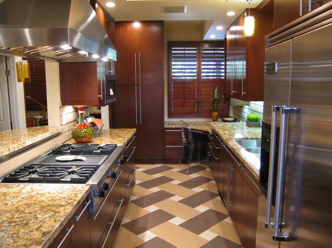 3. Góc bếp được tận dụng tất cả những bức tường để thiết kế hệ thống tủ, giữ lại phần diện tích ở giữa để việc đi lại trong khi nấu nướng, chuẩn bị đồ ăn dễ dàng thuận lợi hơn. Bếp với gam màu gỗ tự nhiên, khéo léo kết hợp sàn bếp với màu đá của mặt tủ đựng đồ tăng sự liên kết ấm cúng và hài hòa cho không gian.