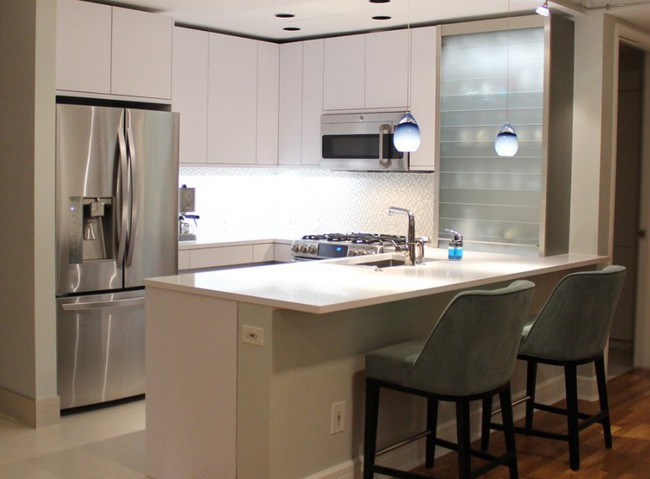 4. Khi không cần sử dụng nhiều đến không gian nấu nướng, bạn có thể chọn góc nhỏ nhất, diện tích khiêm tốn nhất trong nhà để thiết kế bếp. Bếp vẫn không vì thế mà thiếu đi bất kỳ chức năng nào, vẫn có tủ đựng đồ, có máy rửa bát, chậu rửa, nơi nấu nướng dành cho cuộc sống đủ đầy thường ngày.