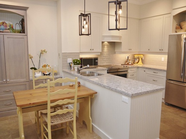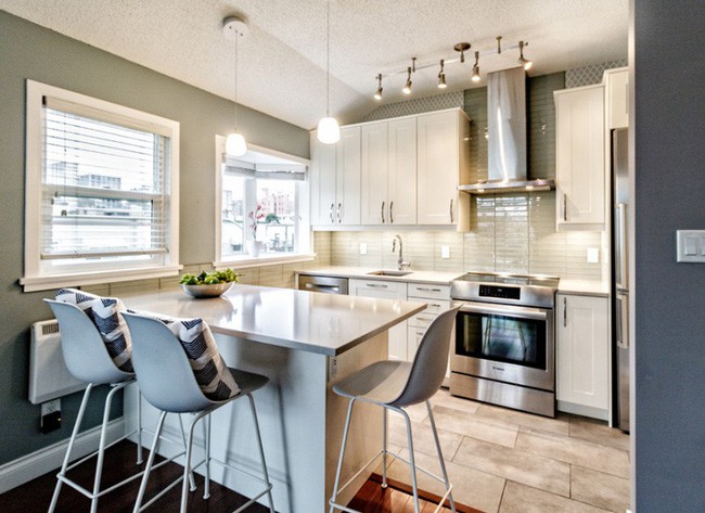7. Bàn bar kèm đảo bếp luôn là giải pháp cứu cánh cho những căn bếp nhỏ. Khi không gian góc bếp được quy hoạch gọn gàng, màu sắc tươi tắn, hài hòa sẽ giúp ngôi nhà nhỏ trở nên rộng rãi, thông thoáng hơn.
