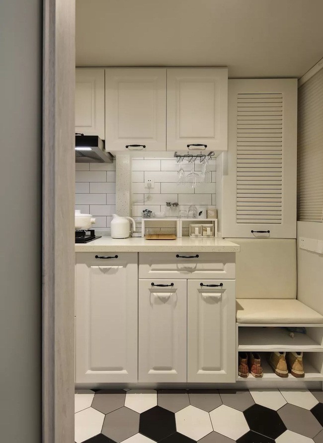 Nhà bếp có bố cục một dòng và tường được làm bằng những viên gạch nhỏ màu trắng kết hợp với tủ màu trắng để tránh không gian hẹp, và mặt đất là gạch hình lục giác.