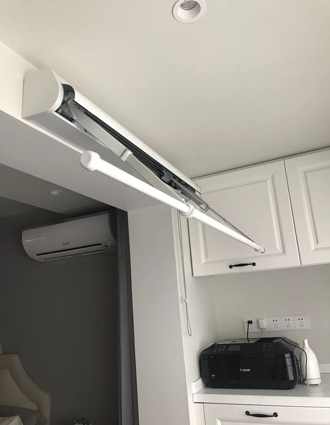 Sấy quần áo cũng được thực hiện ở đây. Trên dầm trần, lắp đặt giá phơi khô ẩn có thể thu vào.