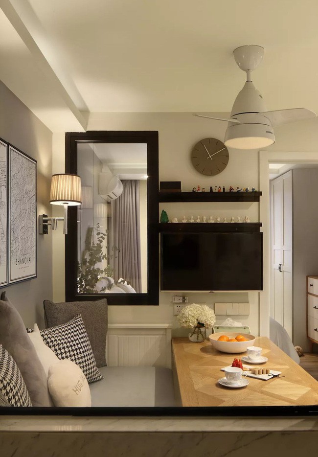 Giá lưu trữ ngoài cùng bên phải cũng rất thông minh, tận dụng tối đa không gian theo chiều dọc, cho dù đó là căn hộ nhỏ hay căn hộ lớn, bạn có thể học hỏi cách lưu trữ này. Đi bộ từ nhà bếp là một hội trường đa năng kết hợp các chức năng của phòng ăn và phòng khách. Màu sắc được chọn để phù hợp với các bản ghi màu xám và trắng. Sofa 2 trong 1, vừa là ghế ngồi vừa là giường. Khi một người bạn đến ở vài hôm, bạn cũng không cần quá lo lắng vì có một ngăn kéo lớn dưới giường sofa để lưu trữ phòng ngủ vô cùng ấn tượng.