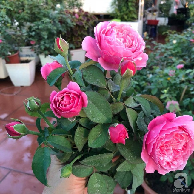 Bên cạnh đó, chị luôn quan tâm đến việc chọn đất tơi xốp, thoát nước tốt giúp bộ rễ được nuôi dưỡng khỏe mạnh. Chị Uyên còn dành thời gian để bón phân cho cây với đủ thành phần đa – trung – vi lượng hoặc phân bón hữu cơ giúp cây luôn khỏe mạnh, lớn nhanh và nở những chùm hoa thật đẹp. Về việc tưới nước, chị luôn chú ý đến việc giữ ẩm cho hoa hồng. Tùy vào điều kiện thời tiết để chị tưới lượng nước phù hợp mà hoa cần.